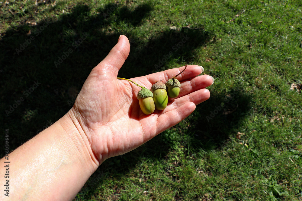 Acorns, fruits of the oak tree Quercus robur lie on the hand