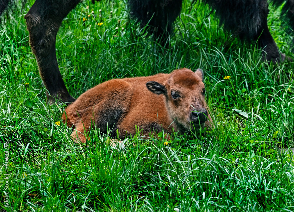 Bison calf on the lawn. Latin name - Bison bison