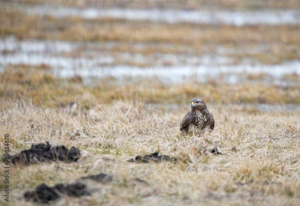 The common buzzard (Buteo buteo) sits next to a mole burrow.