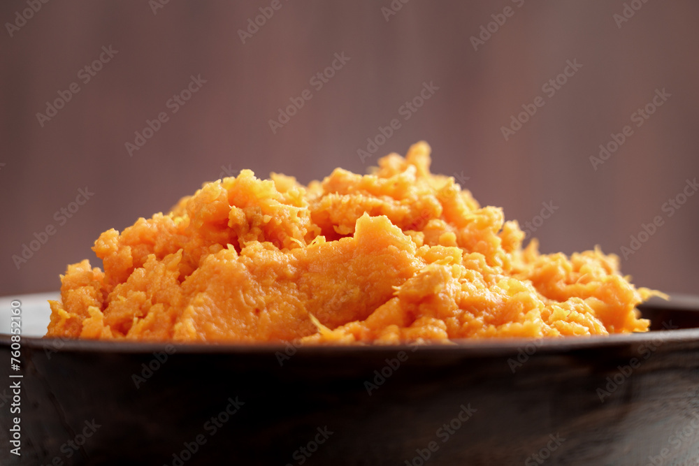 Hot mashed sweet potatoes with steam in wooden bowl. Healthy vegetable puree