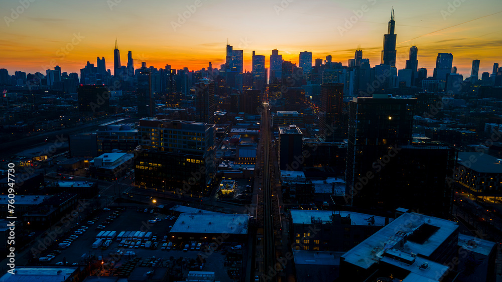 A captivating aerial view of a cityscape at dusk, showcasing illuminated skyscrapers against the darkening sky. The golden hues of sunset paint a serene backdrop, highlighting architectural marvels