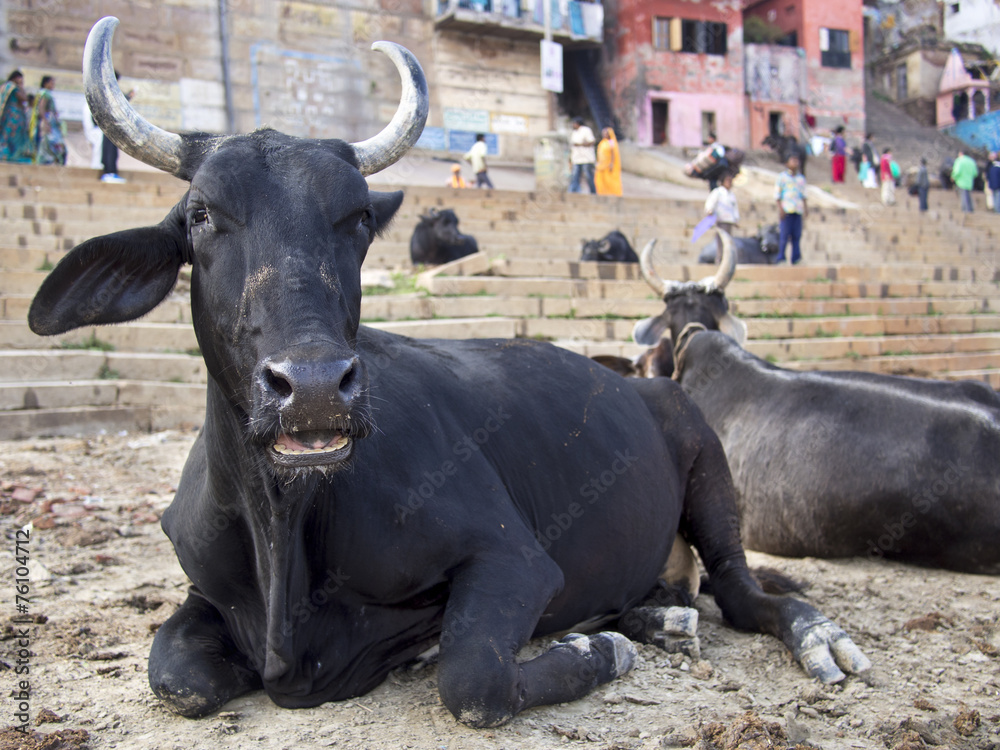 Bulls Sitting on the Ghats By the Ganges in Varanasi, India