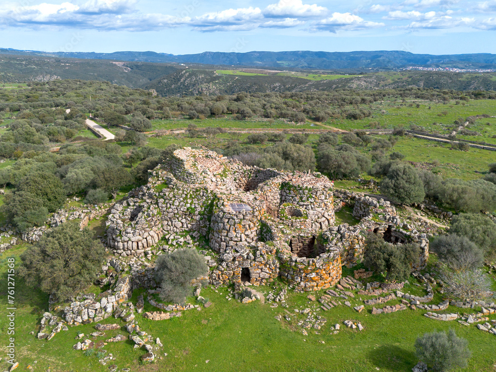 Aerial view with drone of the Nuragic archaeological complex of Nuraghe Arrubiu, Orroli. Monument with 5 towers. Orroli, Sardinia, Italy