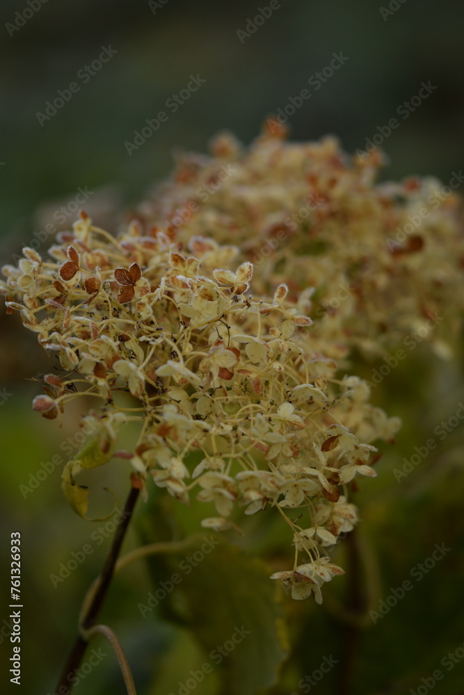 Hydrangea flowers after firt frost, overblowning flowers on bokeh autumn garden background, autumnal background with hydrangea flowers, bokeh, selective focus, closeup.