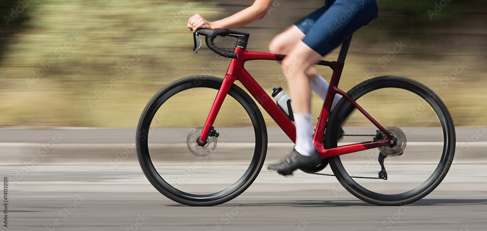 Motion blur of a bike race with the bicycle and rider at high speed. Professional male cyclist in racing outfit during a ride on bike outdoors. Panning technique used