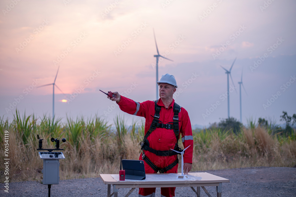 Engineers turbine windmill work in turbine farms rotation resource from windmill turbine model and meteorological collect data to measure the wind force meter is ecology energy concept.