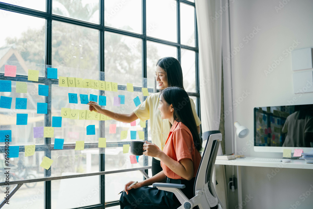 One of them is pointing at a yellow sticky note