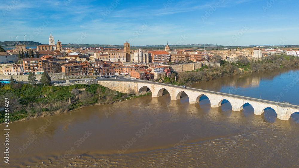 Panoramic aerial view of Tordesillas with the Duero river with great flow during the winter.