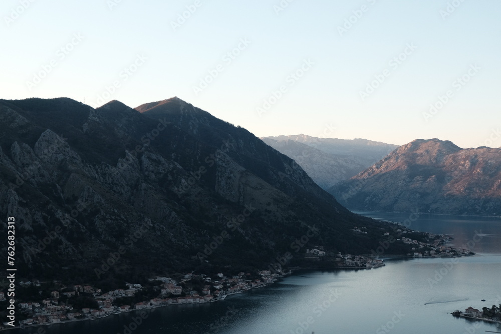 Bay of Kotor and city Montenegro UNESCO World Heritage Site Panoramic view overlooking mountains bay and old town