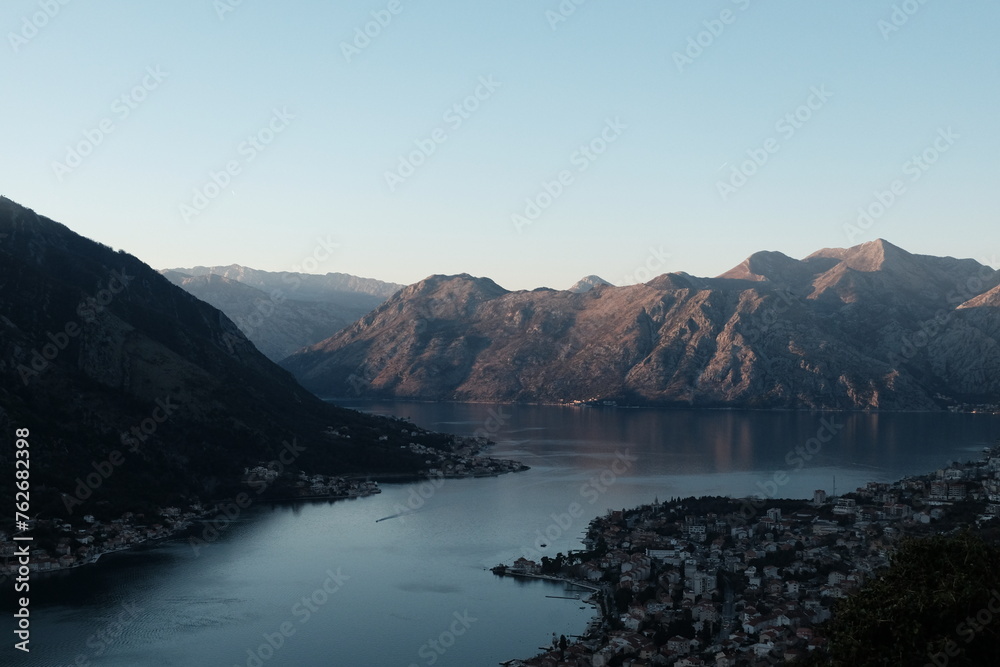 Bay of Kotor and city Montenegro UNESCO World Heritage Site Panoramic view overlooking mountains bay and old town