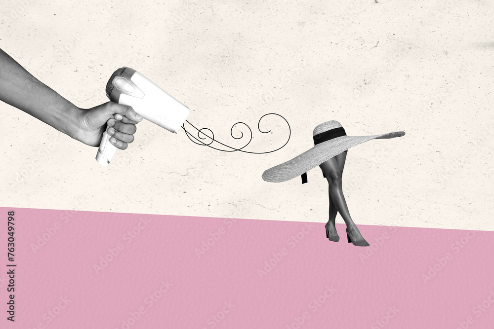 Creative abstract template collage of summer hat walking legs hand hold hairdryer hairdress spa salon fantasy billboard comics zine minimal