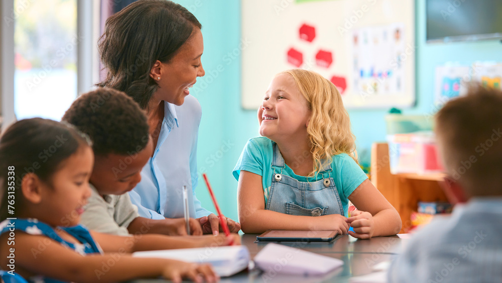 Female Primary Or Elementary School Teacher Helping Students At Desk In Multi-Cultural Class