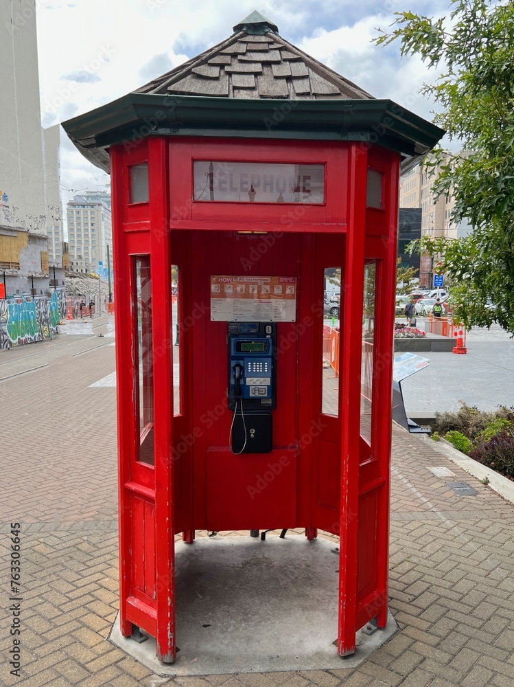 Vintage red wooden telephone booth on the street in Christchurch New zealand