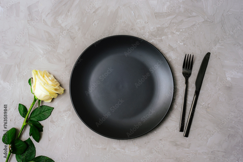 Table place setting with white rose, black plate and cutlery on textured gray background. Top view, flat lay