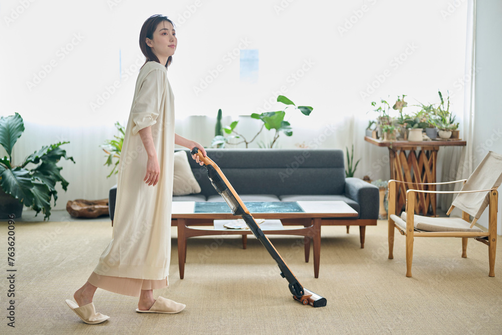 リビングで掃除機をかける20代女性