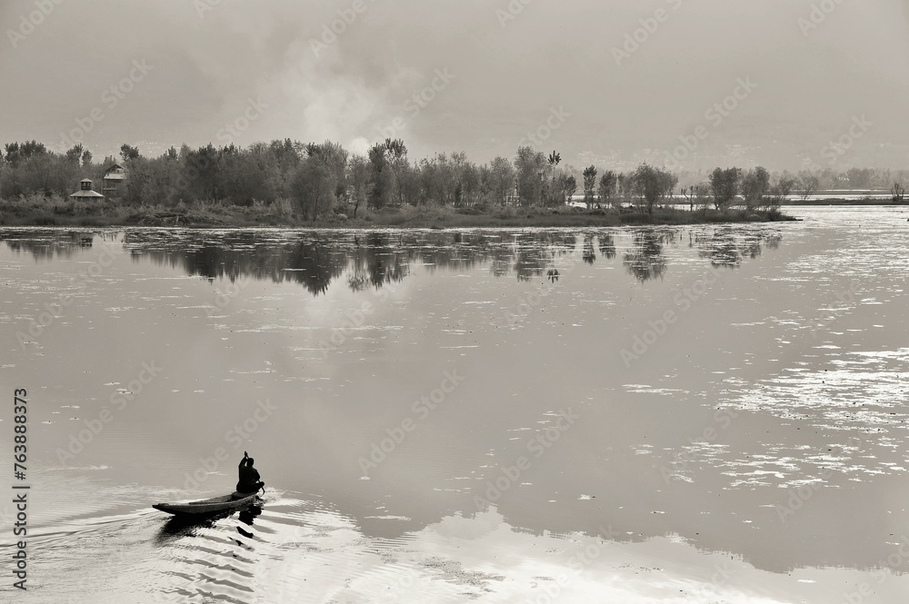 Kashmiri man paddling boat, Nagin Lake, Dal Lake, Srinagar, Kashmir, Jammu and Kashmir, India, Asia