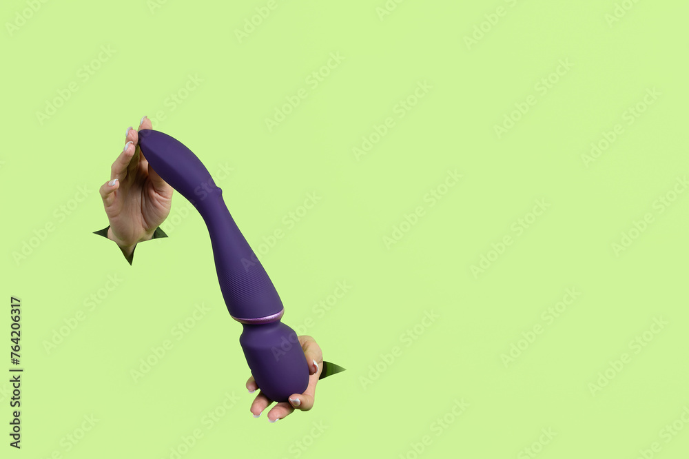 A vibrator. A sex toy on a green background. Consumerism. Copy space