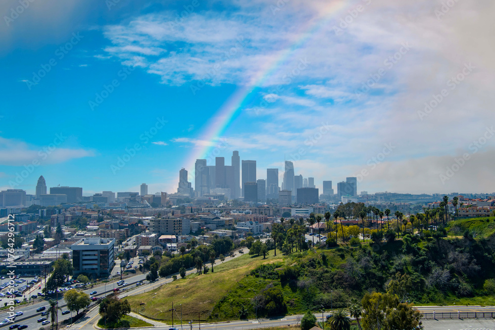 aerial shot of skyscrapers, office buildings and hotels in the city skyline with cars driving on the freeway, lush green trees and grass with blue sky in Los Angeles California USA