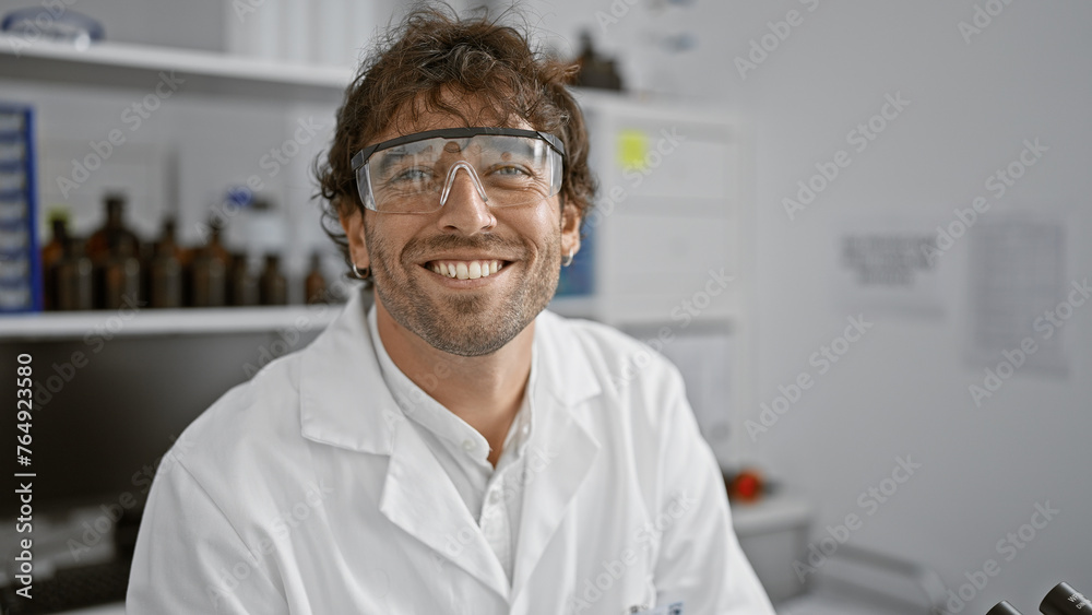 A cheerful hispanic man with a beard and green eyes, wearing safety goggles and a lab coat, stands in an indoor laboratory setting.