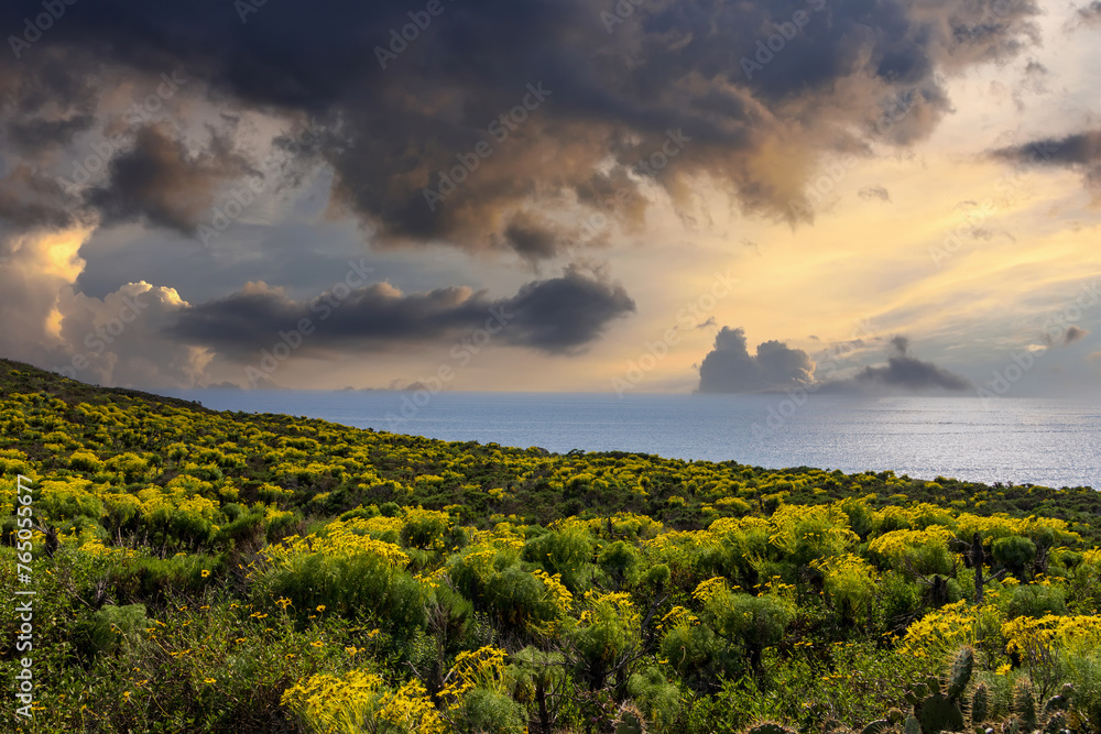 a beautiful spring landscape with a hillside covered with yellow flowers and lush green plants, blue ocean water, blue sky and clouds at Point Dume in Malibu California USA
