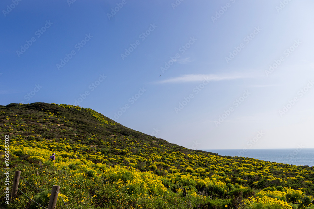 a beautiful spring landscape with a hillside covered with yellow flowers and lush green plants, blue ocean water, blue sky and clouds at Point Dume in Malibu California USA