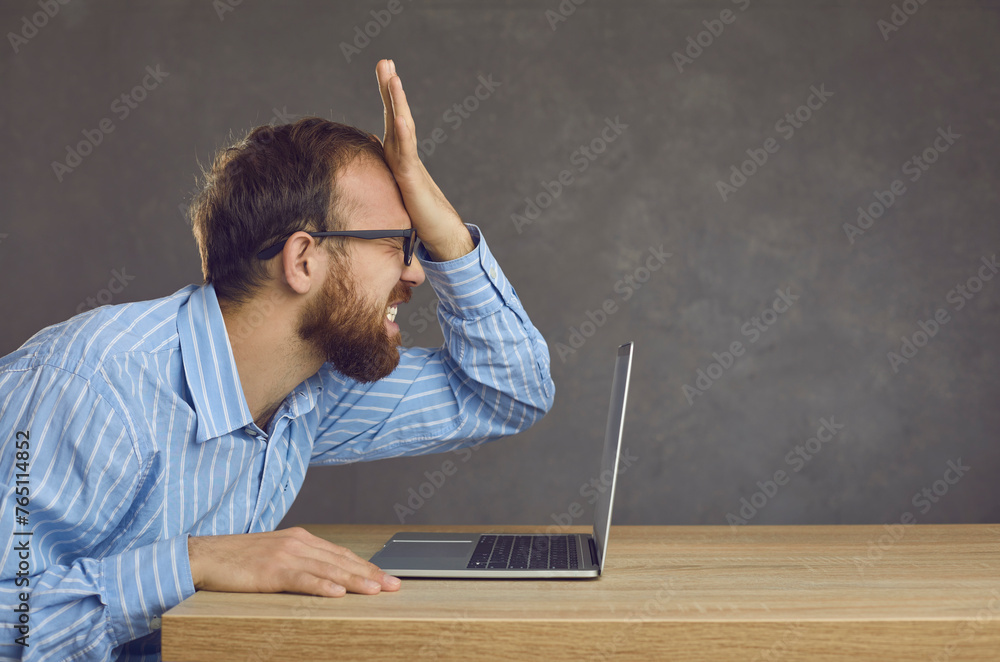 Argh, don't remember it. Side profile view angry ashamed guy slaps face sitting at office desk with laptop. Businessman makes stupid mistake online, forgets password, fails to fix computer malfunction