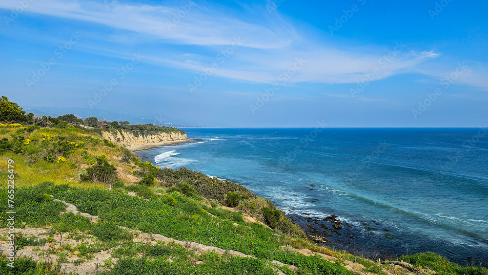 a beautiful spring landscape at Point Dume beach with blue ocean water, lush green trees and plants, homes along the cliffs, waves, blue sky and clouds in Malibu California USA