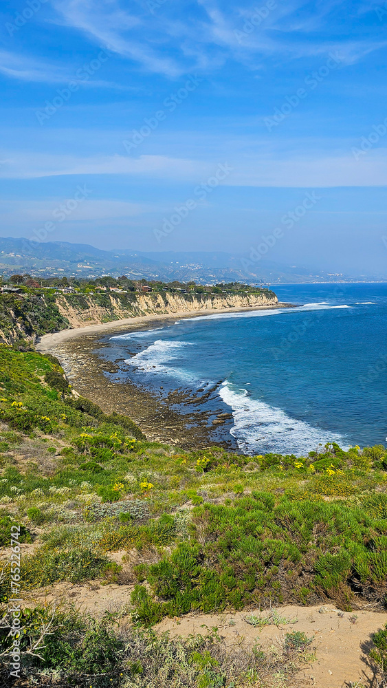 a beautiful spring landscape at Point Dume beach with blue ocean water, lush green trees and plants, homes along the cliffs, waves, blue sky and clouds in Malibu California USA