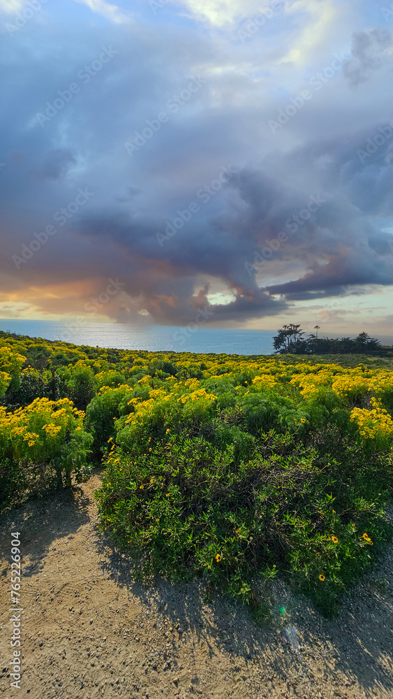 a beautiful spring landscape with a hillside covered with yellow flowers and lush green plants, blue ocean water and powerful clouds at sunset at Point Dume in Malibu California USA