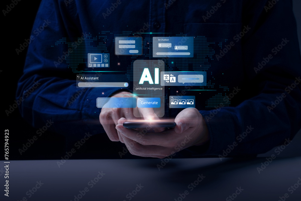 Artificial Intelligence and mobile technology concept. Man using AI Phone for Generative Edit, Live Translate, Circle to Search, Chatbot assistant conversation. generative AI. innovation. smartphone.