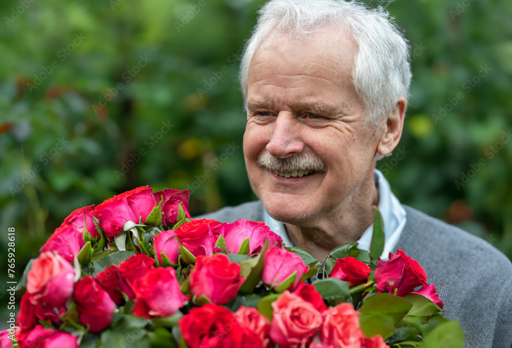 Senior man with a roses bouquet. Symbol for a date at an older age.