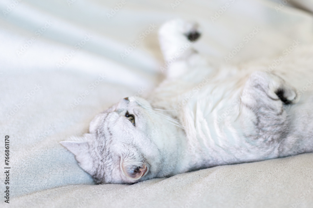 Scottish straight cat lies on his back. Cat upside down. Close up white cat face. Favorite pets, cat food.