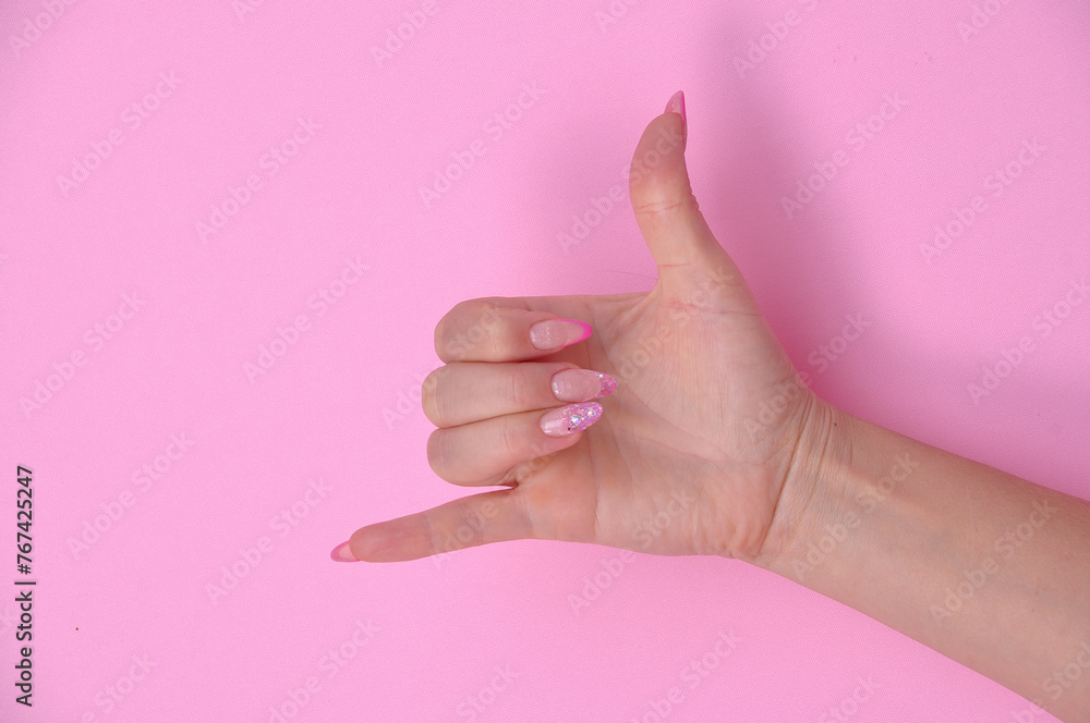 mão feminina com alongamento em fibra de vidro nas unhas fazendo sinal simbolo