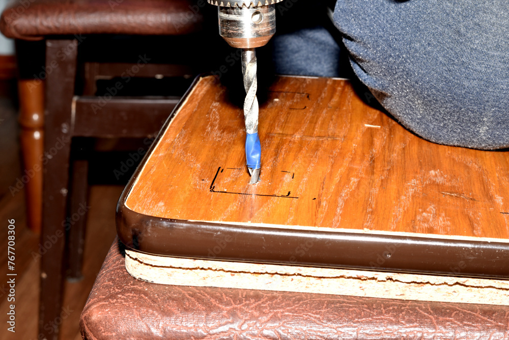 Drill a hole in the board with a drill. Carpentry works. A tool for working with wood.
