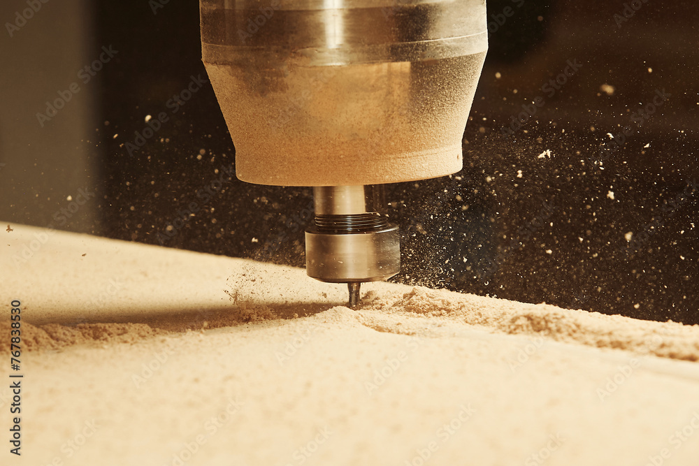 Close-up shot of machine with numerical control cuts wood. Cnc tool.