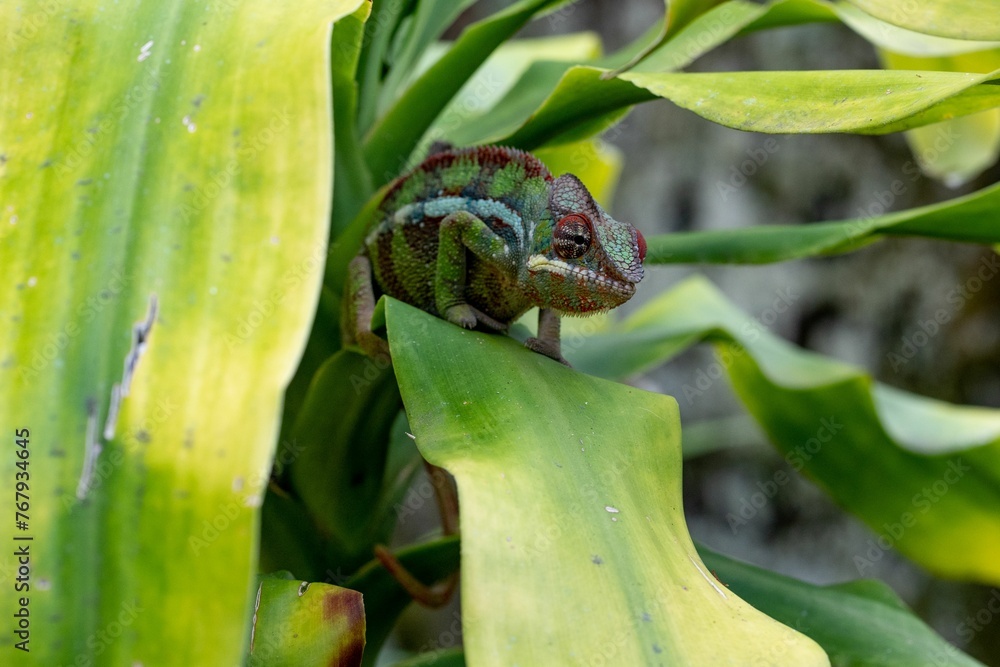 Close-up of a chameleon perched atop a leaf of a tropical plant in the Peyrieras Reserve, Madagascar
