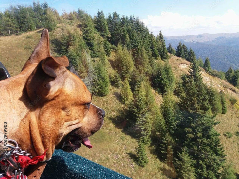 American staffordshire terrier dog in a mountain landscape looking at fir trees