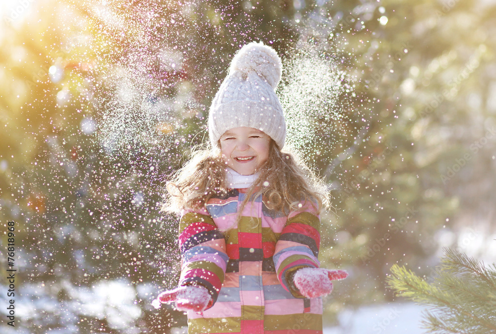 Joyful child having fun with snow in winter day
