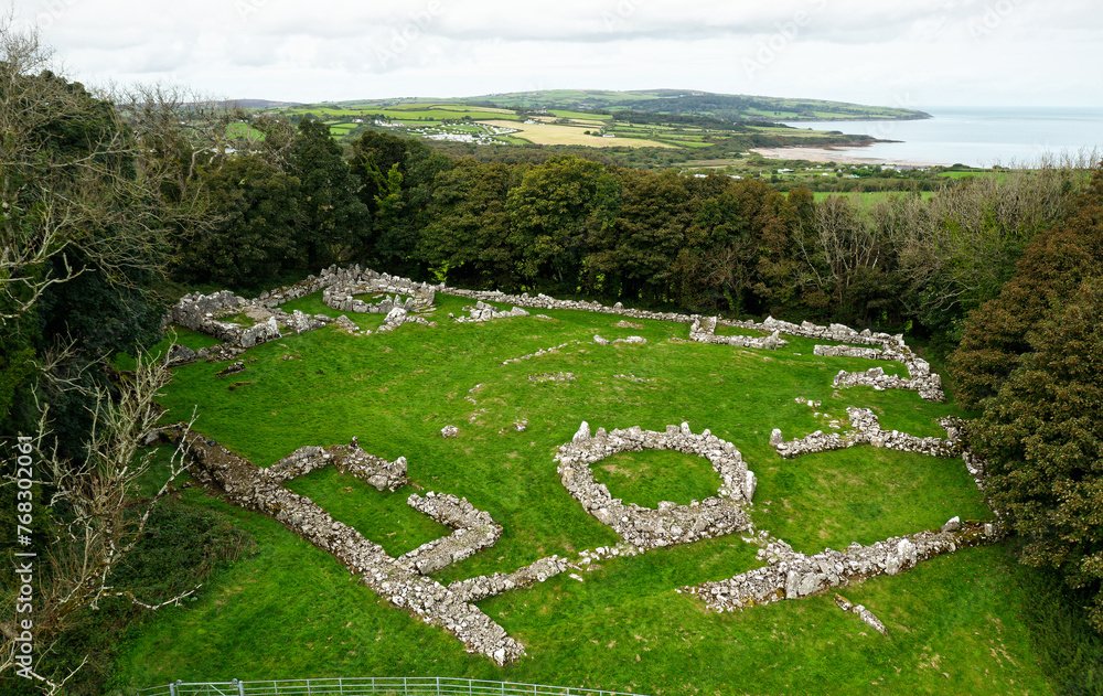 Din Lligwy Iron Age Roman enclosure settlement. Round house and metal workshop foundations. Near Moelfre, Anglesey, north Wales, UK. Looking N.W.