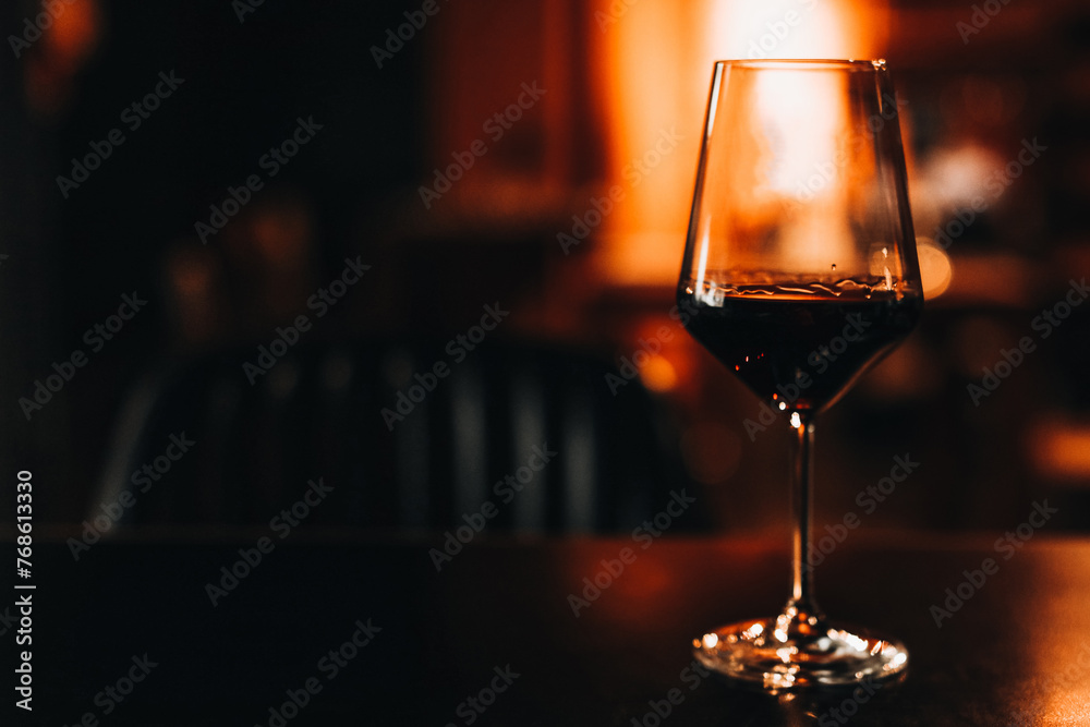 Dark red wine glass on a wooden table in the evening romantic bokeh light