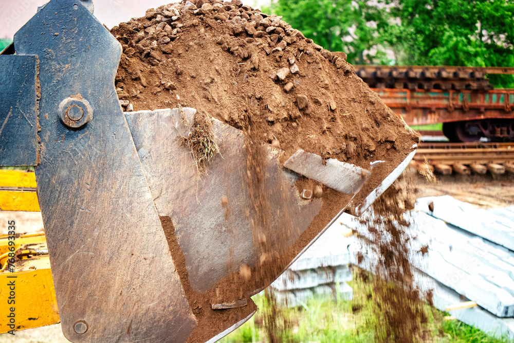 A pile of dirt sits next to a large shovel in a construction site. loader