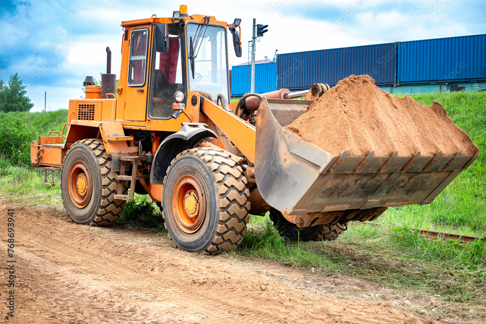 A bright yellow tractor or a loader is stationary on a dusty dirt road in a rural area