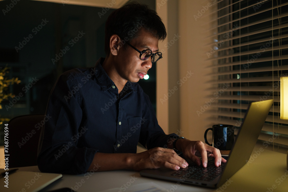 Focused businessman working overtime in an office at night.