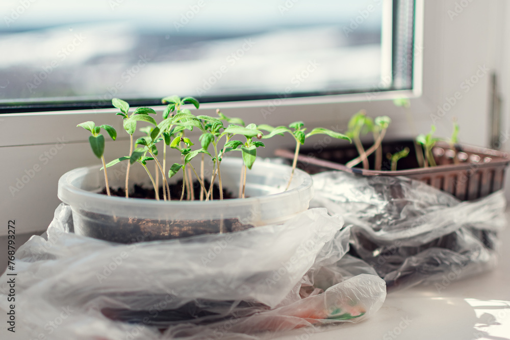 Gardening concept. Green sprouts of seedlings grown from seeds. Seedlings of tomatoes in a pot with soil on windowsill.