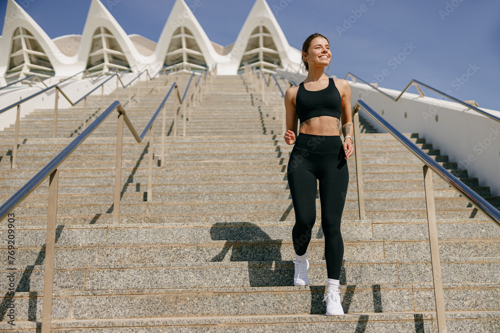 Smiling active female athlete in sportswear running on steps outdoors in early morning
