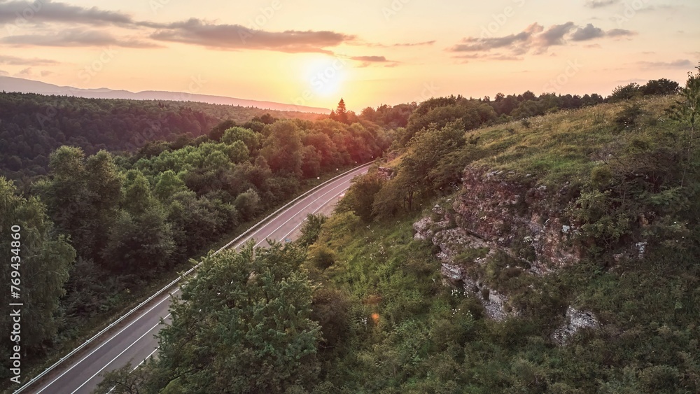 Mountain landscape from a high point and a road. Travel and tourism. The time of year is the end of summer or the beginning of autumn. Sunset time of the day.