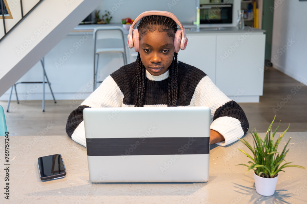 A young African American girl is deeply engrossed in her studies while wearing pink headphones, using a laptop in a bright, modern kitchen. A smartphone rests beside her, and a green plant adds a