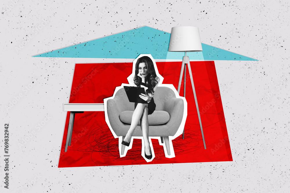Composite photo collage of serious girl sit home agent hold clipboard armchair lamp table comfort property isolated on painted background