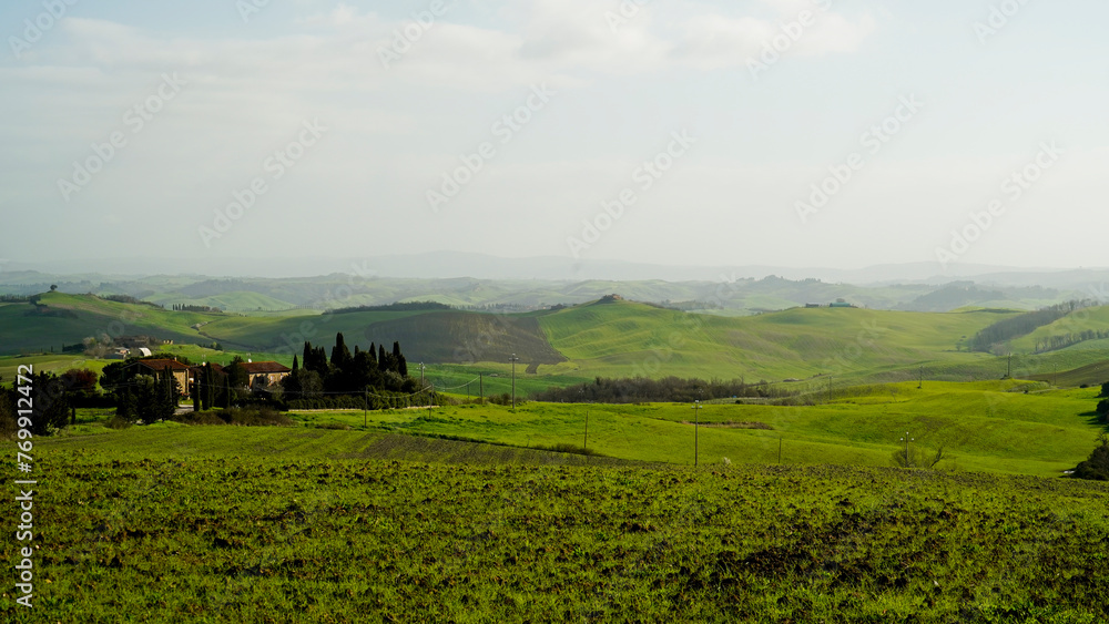 Panorama collinare della Val d'Orcia lungo il percorso ciclistico dell'Eroica. Provincia di Siena. Toscana , Italia