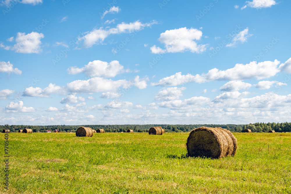 Beautiful countryside landscape. Round straw bales in harvested fields and summer sky.